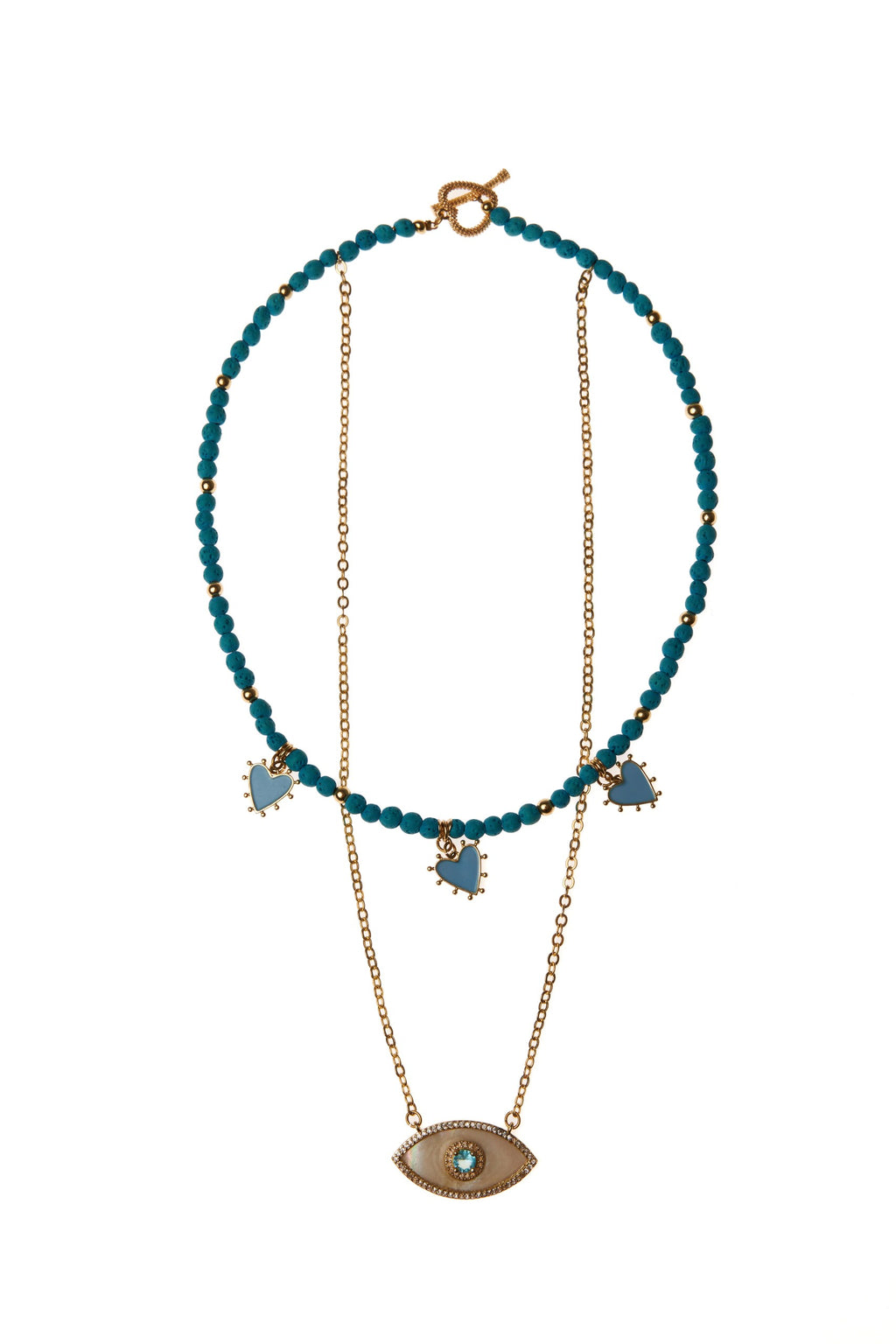 Turquoise beads meet delicate gold chains, finished with a signature eye pendant and soft heart details. A balance of protection, femininity, and bold energy — all in one piece.